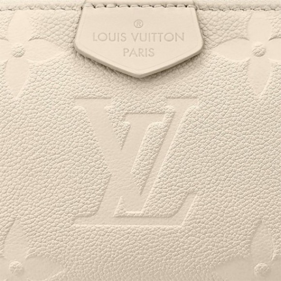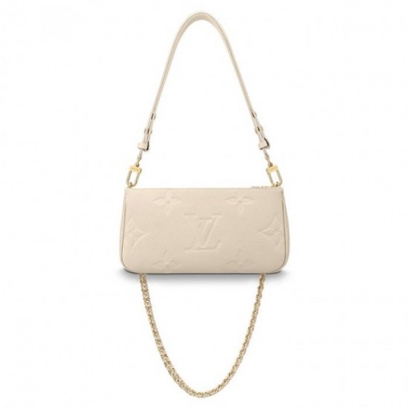 The Multi Pochette Accessoires bag in beige Monogram Empreinte leather consists of two pouches joined together. Both bags are lined with matching cream microfiber, and the larger bag also includes an interior pocket. Since both the chain and shoulder strap are removable, this bag becomes extremely versatile.