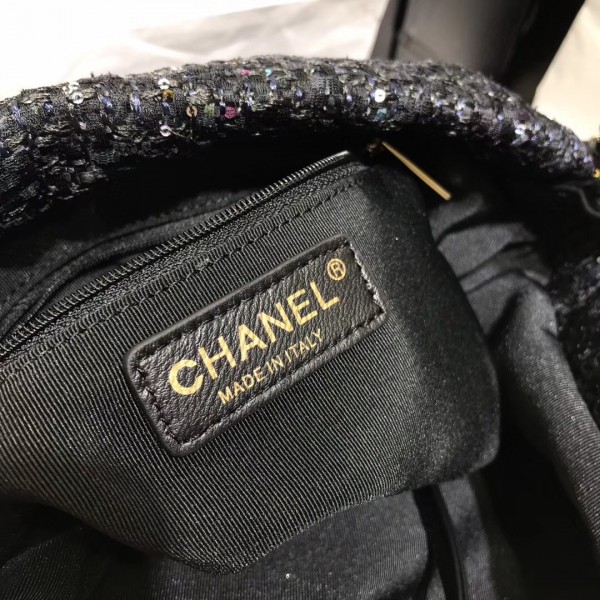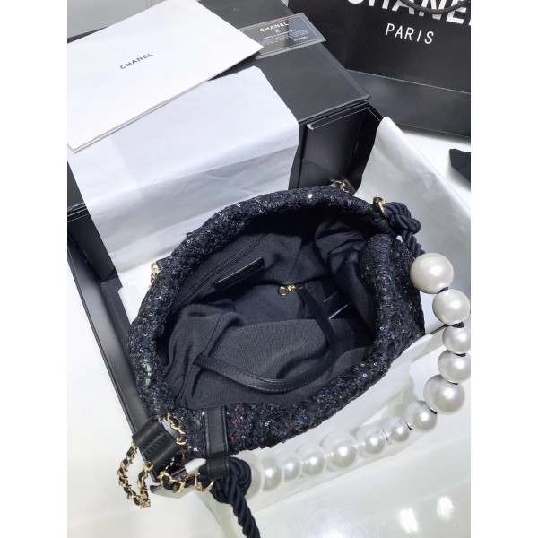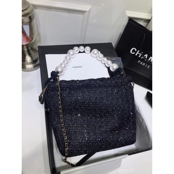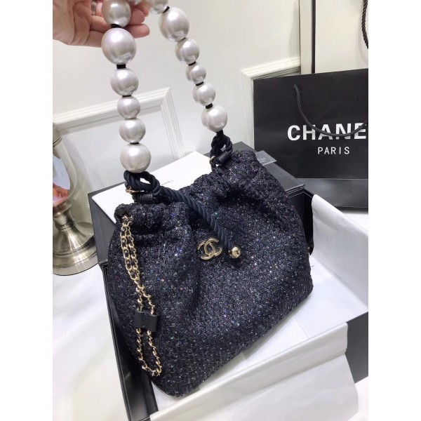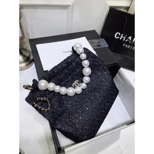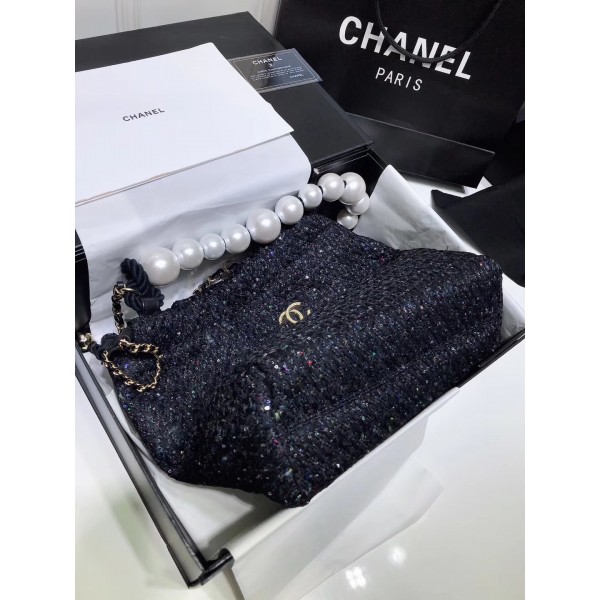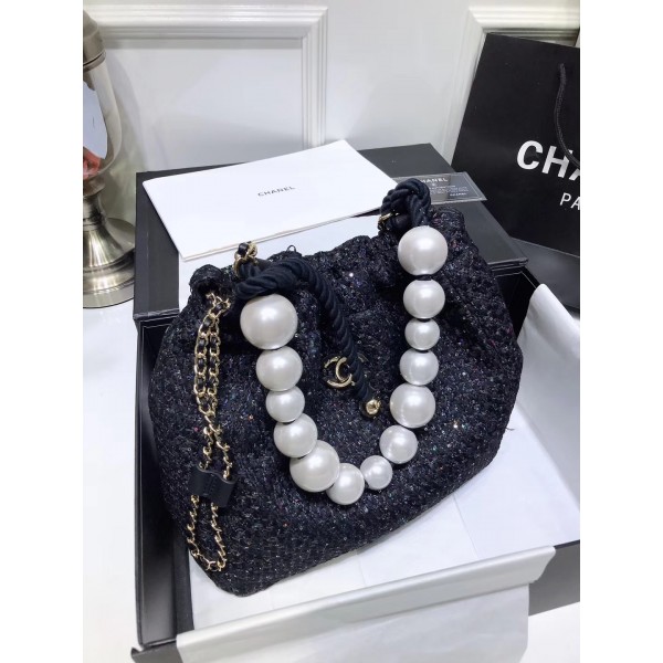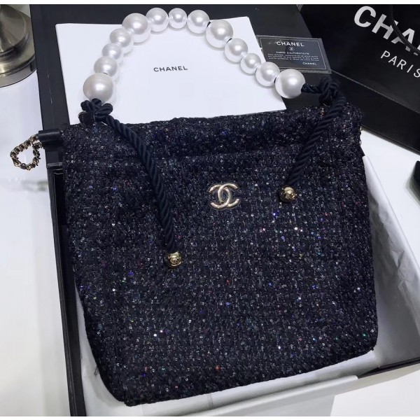 Chanel Tweed with Pearls Hobo Shopping Tote Bag Navy Blue 2019 AQ01095