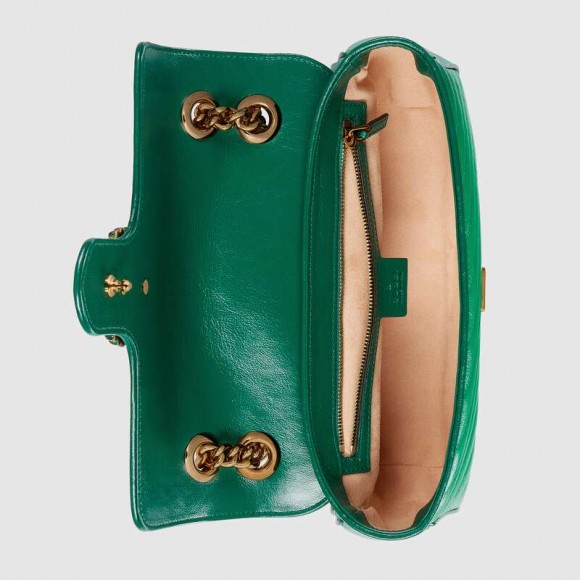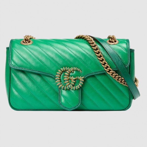 Signature styles from the Beloved lines are presented in vibrant colors that recall precious gems. Here the GG Marmont is introduced in emerald toned green leather with a diagonal matelassé finish. The shoulder bag is completed by its signature Double G hardware, enhanced by tonal enamel details.