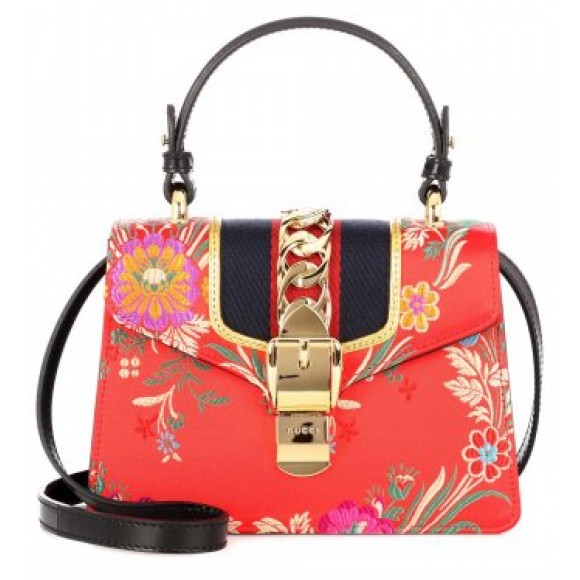 Ad a sumptuous accent to your look with the endlessly extravagant Sylvie Mini shoulder bag from Gucci. The sheeny satin in a rich red hue comes embroidered with an intricate floral pattern, while glossy golden hardware adds luxe elevation. Carry yours by the ladylike top handle or attach the shoulder strap to go hands-free.