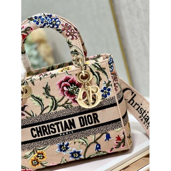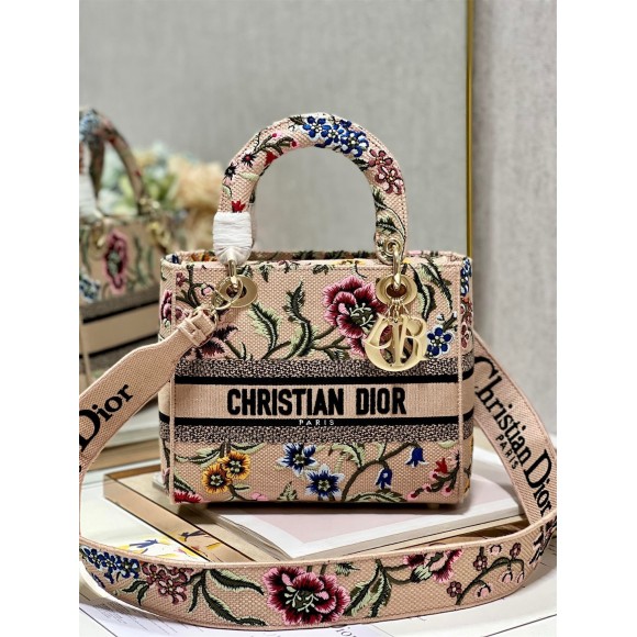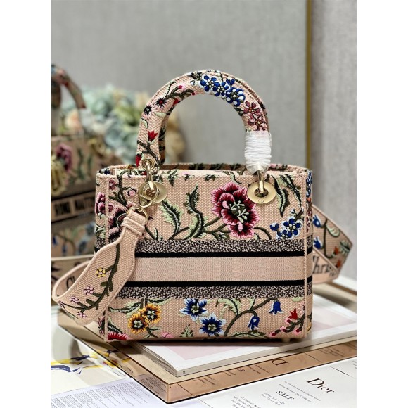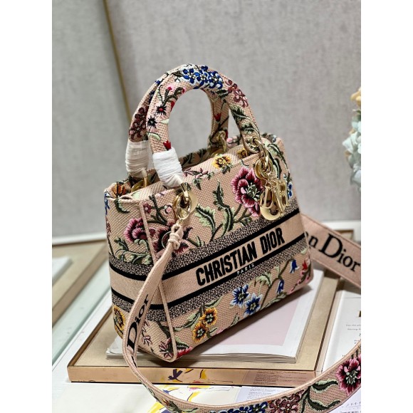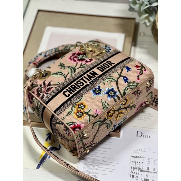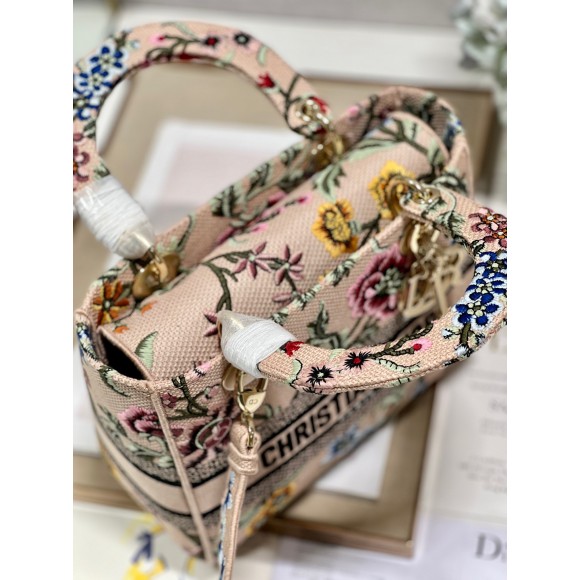 Dior Lady D-Lite Medium Bag In Beige Raffia Embroidered with Dior Petites Fleurs